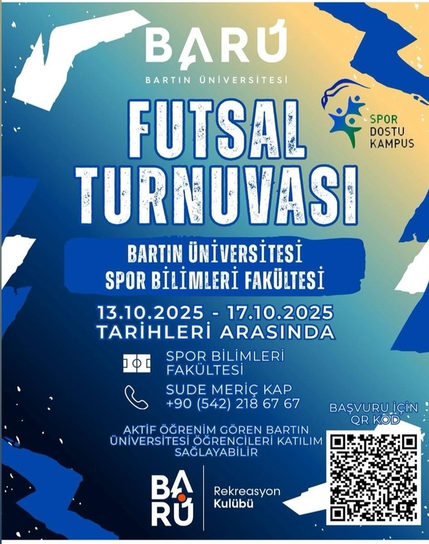 Bartın Üniversitesi Spor Bilimleri Fakültesi tarafından düzenlenen BARÜ Futsal Turnuvası, 13-17 Ekim 2025 tarihleri arasında gerçekleştirilecektir.
